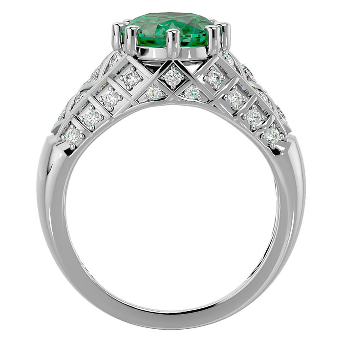 This stunning gemstone and diamond ring features one 10x8mm oval shape emerald gemstone at 2.25 carats. It is surrounded by 38 sparkling diamonds in I-J color, I1-I2 clarity at 0.38 carats. Total gem weight is 2.63 carats. This ring is crafted in 10 karat white gold.