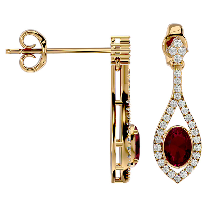 These elegant gemstone earrings feature two 7x5mm oval shape ruby gemstones at approximately 1.90 carats. They are surrounded by 62 sparkling diamonds in I-J color, I1-I2 clarity at 1/2 carat total weight. Total gem weight is approximately 2.40 carats. These earrings are in 14 karat yellow gold and have comfortable and secure friction backs. Each earring dangles down 1 inch.