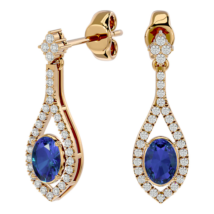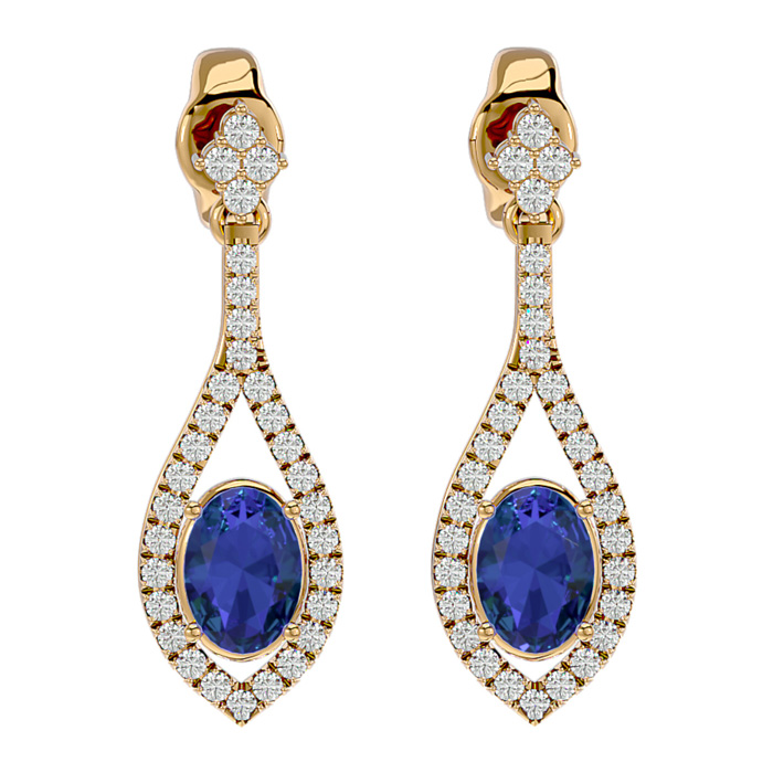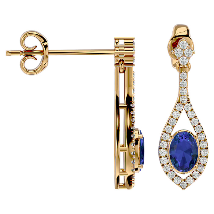 These elegant gemstone earrings feature two 7x5mm oval shape tanzanite gemstones at approximately 1.90 carats. They are surrounded by 62 sparkling diamonds in I-J color, I1-I2 clarity at 1/2 carat total weight. Total gem weight is approximately 2.40 carats. These earrings are in 14 karat yellow gold and have comfortable and secure friction backs. Each earring dangles down 1 inch.