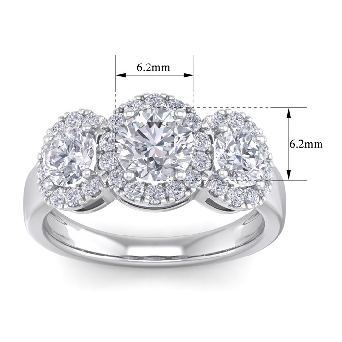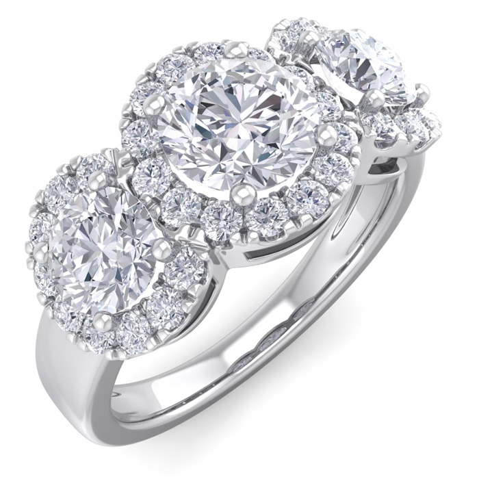 2 1/2 Carat Round Shape Halo Diamond Three Stone Ring In 14K White Gold. Incredible Value For A Large Fiery Diamond Ring