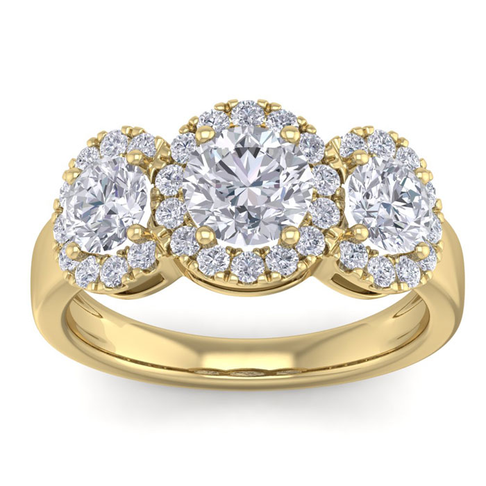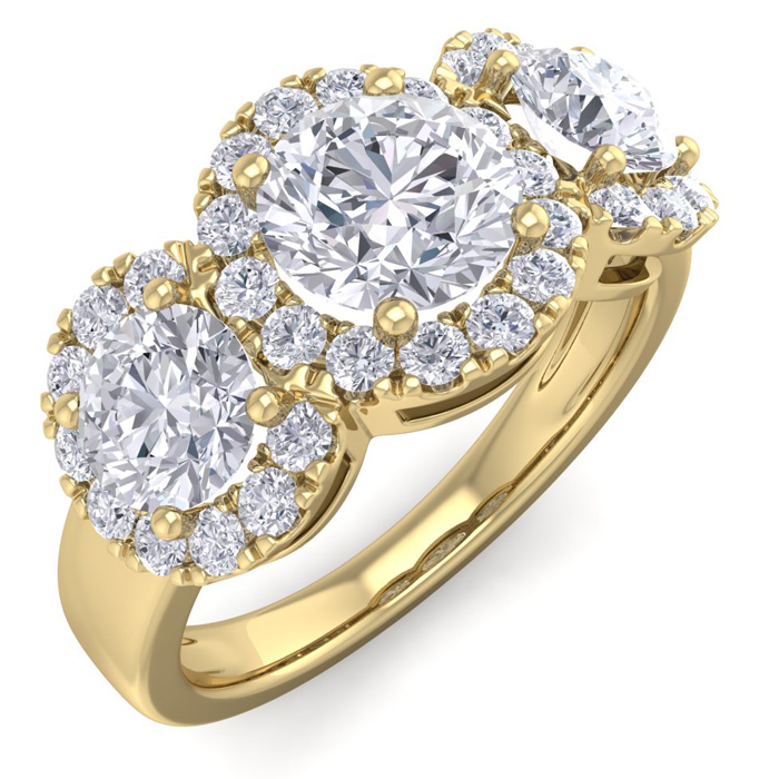 2 1/2 Carat Round Shape Halo Diamond Three Stone Ring In 14K Yellow Gold. Incredible Value For A Large Fiery Diamond Ring
