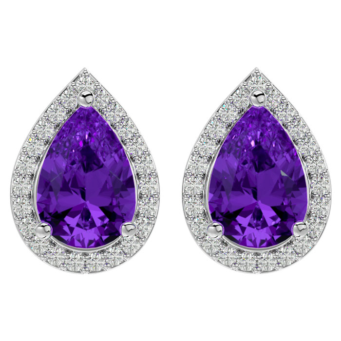 These elegant gemstone earrings feature two 9x6mm pear shape amethyst gemstones at approximately 2.10 carats. They are surrounded by 48 sparkling diamonds in I-J color, I1-I2 clarity at 1/4 carat total weight. Total gem weight is approximately 2 1/3 carats. These earrings are in 14 karat white gold and have comfortable and secure friction backs.