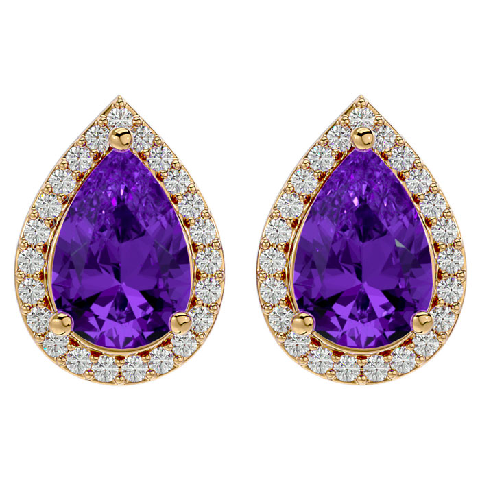 These elegant gemstone earrings feature two 9x6mm pear shape amethyst gemstones at approximately 2.10 carats. They are surrounded by 48 sparkling diamonds in I-J color, I1-I2 clarity at 1/4 carat total weight. Total gem weight is approximately 2 1/3 carats. These earrings are in 14 karat yellow gold and have comfortable and secure friction backs.