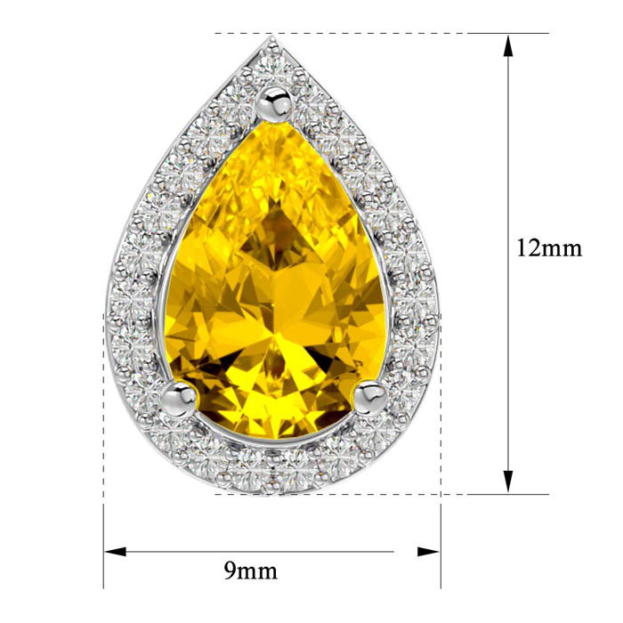 These elegant gemstone earrings feature two 9x6mm pear shape citrine gemstones at approximately 2.10 carats. They are surrounded by 48 sparkling diamonds in I-J color, I1-I2 clarity at 1/4 carat total weight. Total gem weight is approximately 2 1/3 carats. These earrings are in 14 karat white gold and have comfortable and secure friction backs.