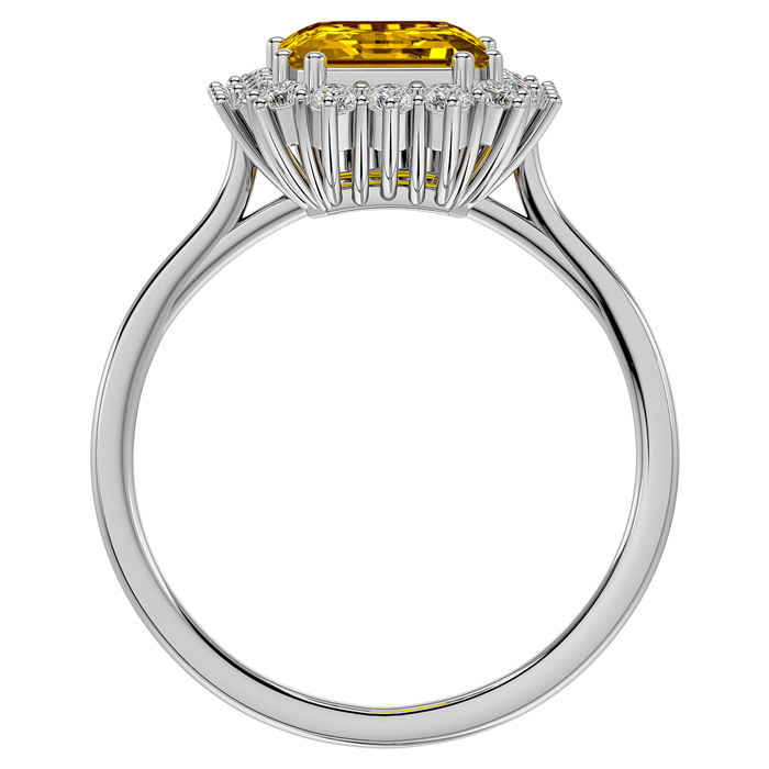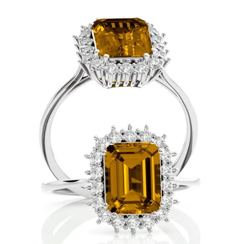 This stunning gemstone and diamond ring features one 9x7mm emerald cut citrine gemstone at 2 carats. It is surrounded by 18 sparkling diamonds in I-J color, I1-I2 clarity at 1/3 carat. Total gem weight is approximately 2 1/3 carats. This ring is crafted in 14 karat white gold.