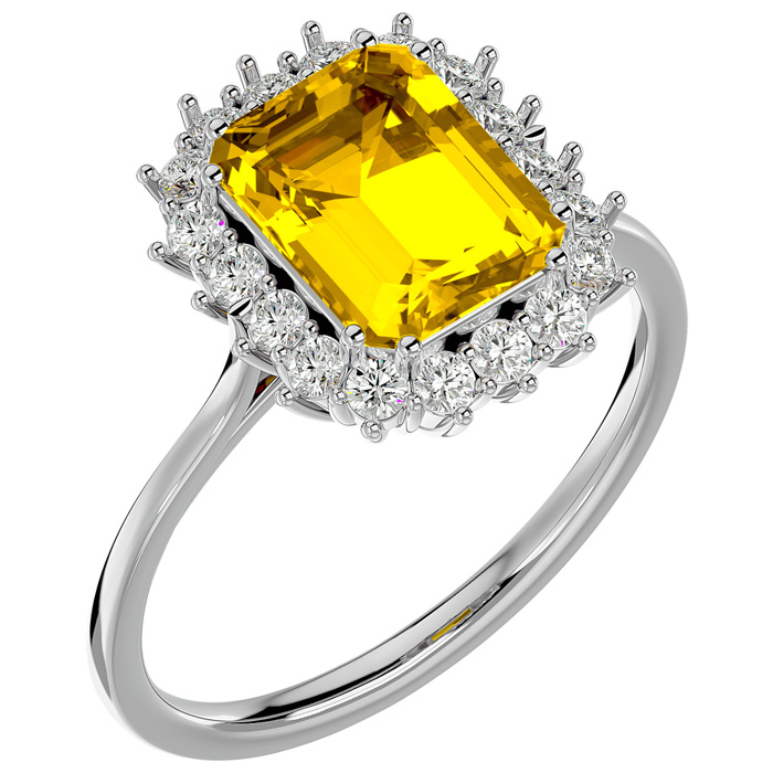 This stunning gemstone and diamond ring features one 9x7mm emerald cut citrine gemstone at 2 carats. It is surrounded by 18 sparkling diamonds in I-J color, I1-I2 clarity at 1/3 carat. Total gem weight is approximately 2 1/3 carats. This ring is crafted in 14 karat white gold. *Retrograde Birthstones™ flips the idea of traditional birthstones. Wear your ½ birthday birthstone, your Retrograde Birthstone, “The Birthstone For Your Bad Side™.