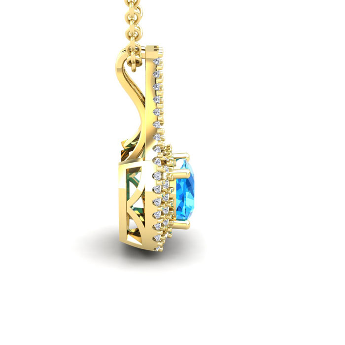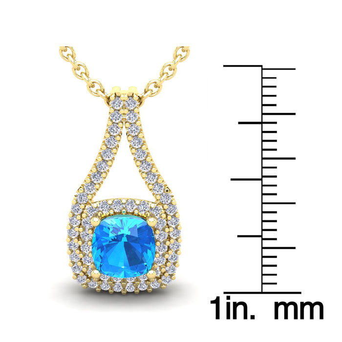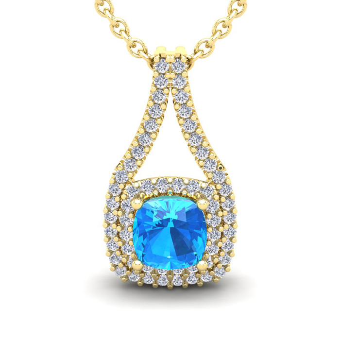 This stunning gemstone and halo diamond necklace features one 7x7mm cushion cut blue topaz gemstone at 1.74 carats. It is surrounded by 58 sparkling diamonds in a halo in I-J color, SI2-I1 clarity at 0.58 carats. Total gem weight is 2.32 carats. This necklace is crafted in 14 karat yellow gold and comes with an 18 inch cable chain with spring-ring clasp.