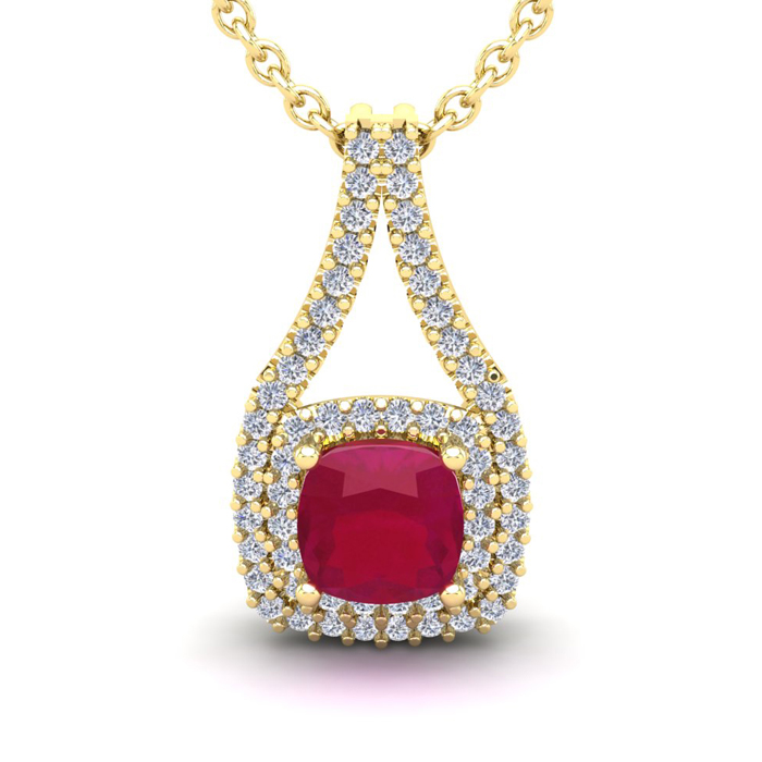 This stunning gemstone and halo diamond necklace features one 7x7mm cushion cut created ruby gemstone at 1.77 carats. It is surrounded by 58 sparkling diamonds in a halo in I-J color, SI2-I1 clarity at 0.58 carats. Total gem weight is 2.35 carats. This necklace is crafted in 14 karat yellow gold and comes with an 18 inch cable chain with spring-ring clasp.