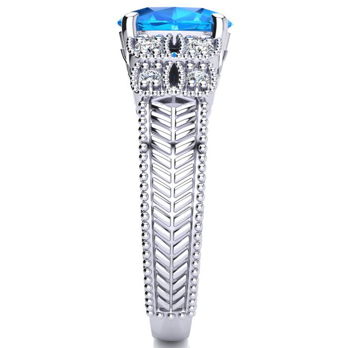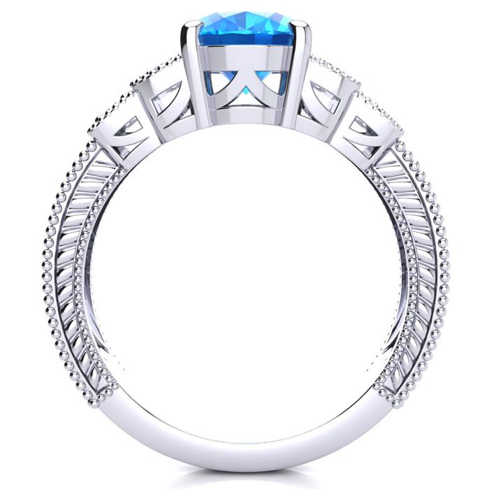 This stunning gemstone and diamond ring features one 9x7mm oval shape blue topaz gemstone at 2.15 carats. It is surrounded by 8 sparkling diamonds in I-J color, I1-I2 clarity at 0.16 carats. Total gem weight is 2.31 carats. This ring is crafted in 10 karat white gold.