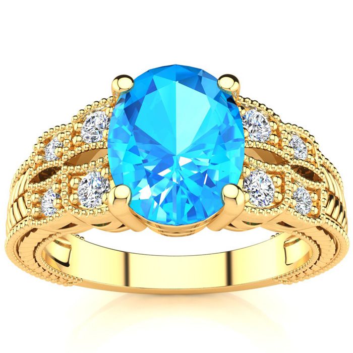 2 1/3 Carat Oval Shape Blue Topaz and Diamond Ring In 10 Karat Yellow Gold