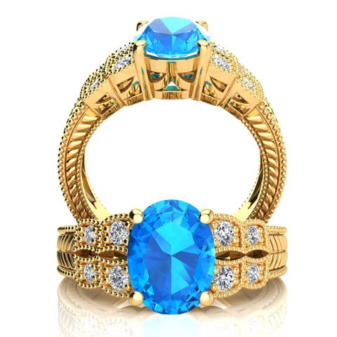 This stunning gemstone and diamond ring features one 9x7mm oval shape blue topaz gemstone at 2.15 carats. It is surrounded by 8 sparkling diamonds in I-J color, I1-I2 clarity at 0.16 carats. Total gem weight is 2.31 carats. This ring is crafted in 10 karat yellow gold.