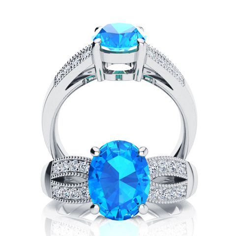 2 1/3 Carat Oval Shape Blue Topaz and Diamond Ring In 14 Karat White Gold