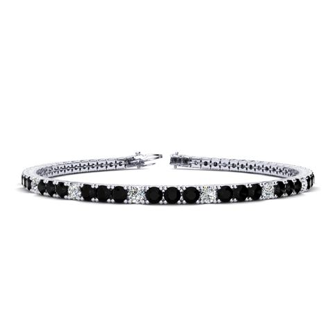 This classic gemstone bracelet features shimmering white diamonds in J-K color, I1-I2 clarity and black diamonds in I3 clarity. The 6 inch bracelet contains 57 black and white diamonds at 2.28 carats. The 6.5 inch bracelet contains 62 black and white diamonds at 2.48 carats. The 7 inch bracelet contains 67 black and white diamonds at 2.68 carats. The 7.5 inch bracelet contains 72 black and white diamonds at 2.88 carats. The 8 inch bracelet contains 76 black and white diamonds at 3.04 carats. The 8.5 inch bracelet contains 81 black and white diamonds at 3.24 carats. The 9 inch bracelet contains 86 black and white diamonds at 3.44 carats. This bracelet is approximately 2.25mm wide and is crafted in 14 karat white gold. This bracelet has a secure, box with tongue and safety clasp.