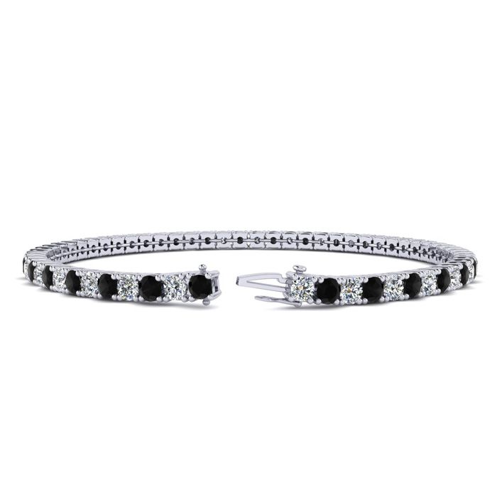 This classic gemstone bracelet features shimmering white diamonds in J-K color, I1-I2 clarity and black diamonds in I3 clarity. The 6 inch bracelet contains 57 black and white diamonds at 2.28 carats. The 6.5 inch bracelet contains 62 black and white diamonds at 2.48 carats. The 7 inch bracelet contains 67 black and white diamonds at 2.68 carats. The 7.5 inch bracelet contains 72 black and white diamonds at 2.88 carats. The 8 inch bracelet contains 76 black and white diamonds at 3.04 carats. The 8.5 inch bracelet contains 81 black and white diamonds at 3.24 carats. The 9 inch bracelet contains 86 black and white diamonds at 3.44 carats. This bracelet is approximately 2.25mm wide and is crafted in 14 karat white gold. This bracelet has a secure, box with tongue and safety clasp.