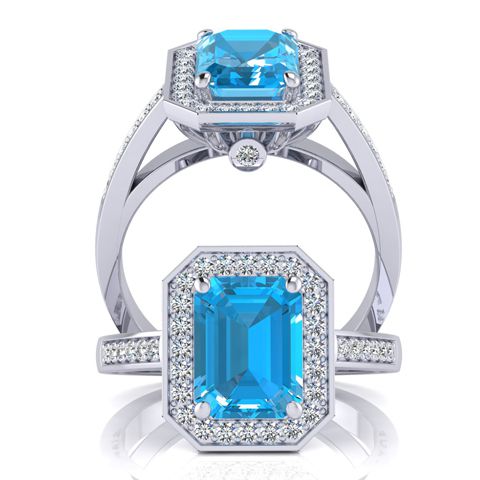 This stunning gemstone and halo diamond ring features one 8x6mm emerald shape blue topaz gemstone at 1.90 carats. It is surrounded by 38 sparkling diamonds in a halo and down the band in I-J color, SI2-I1 clarity at 0.39 carats. Total gem weight is 2.29 carats. This ring is crafted in 14 karat white gold.