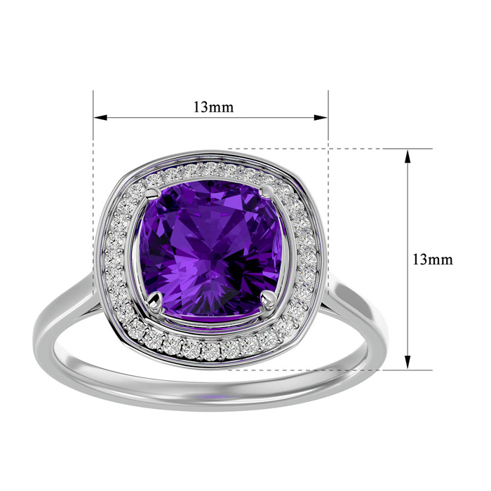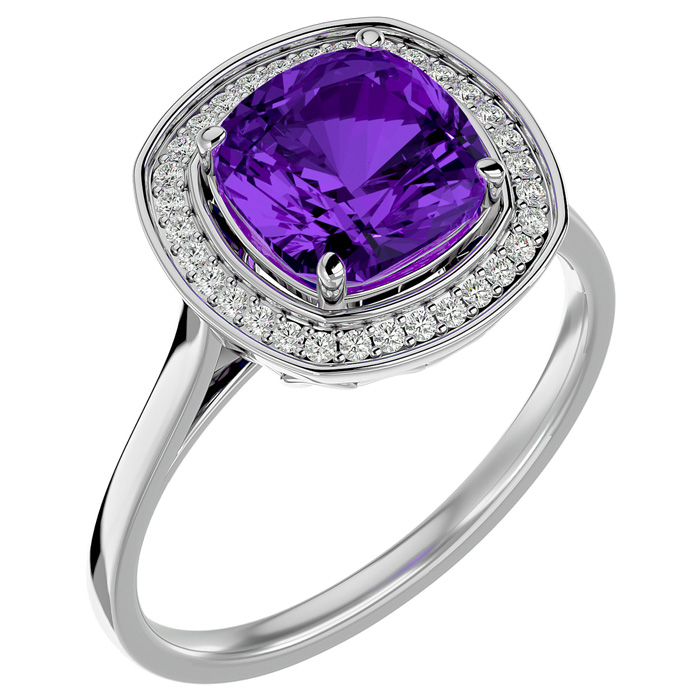 This stunning gemstone and diamond ring features one 8x8mm cushion cut amethyst gemstone at 2.10 carats. It is surrounded by 32 sparkling diamonds in I-J color, I1-I2 clarity at 0.16 carats. Total gem weight is approximately 2 1/4 carats. This ring is crafted in 14 karat white gold.