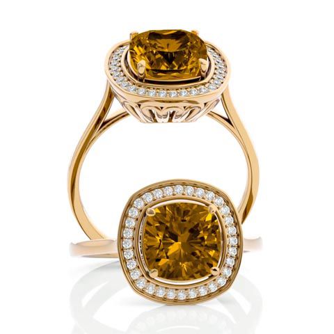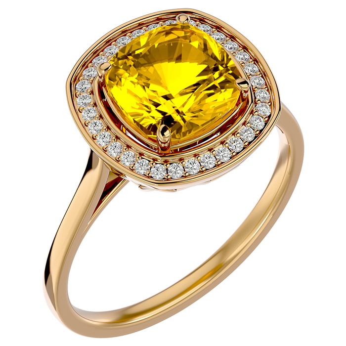 2 1/4 Carat Cushion Cut Citrine and Halo Diamond Ring In 14K Yellow Gold