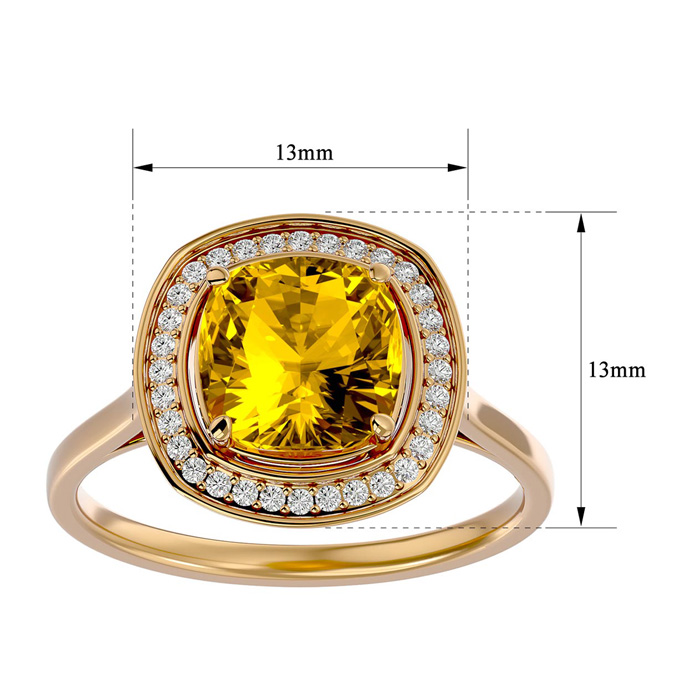 This stunning gemstone and diamond ring features one 8x8mm cushion cut citrine gemstone at 2.10 carats. It is surrounded by 32 sparkling diamonds in I-J color, I1-I2 clarity at 0.16 carats. Total gem weight is approximately 2 1/4 carats. This ring is crafted in 14 karat yellow gold.