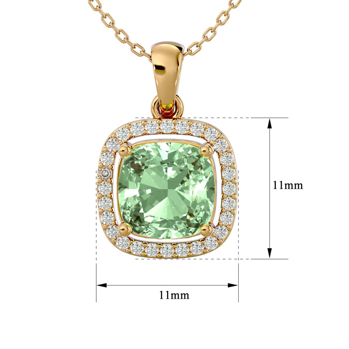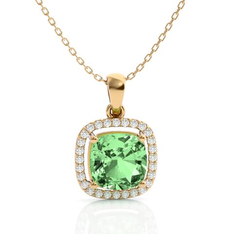 2 1/4 Carat Cushion Cut Green Amethyst and Halo Diamond Necklace In 14 Karat Yellow Gold, 18 Inches