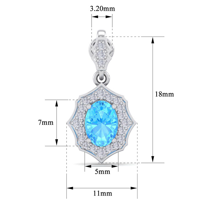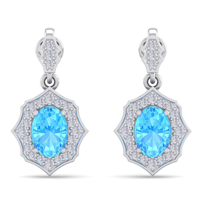These elegant gemstone earrings feature two 7x5mm oval shape blue topaz gemstones at approximately 2 carats. They are surrounded by 46 sparkling diamonds in I-J color, I1-I2 clarity at 1/4 carat total weight. Total gem weight is approximately 2 1/4 carat total weight. These earrings are in 14 karat white gold and have comfortable and secure friction backs. Each earring dangles down 3/4 inch. *Retrograde Birthstones™ flips the idea of traditional birthstones. Wear your ½ birthday birthstone, your Retrograde Birthstone, “The Birthstone For Your Bad Side™.