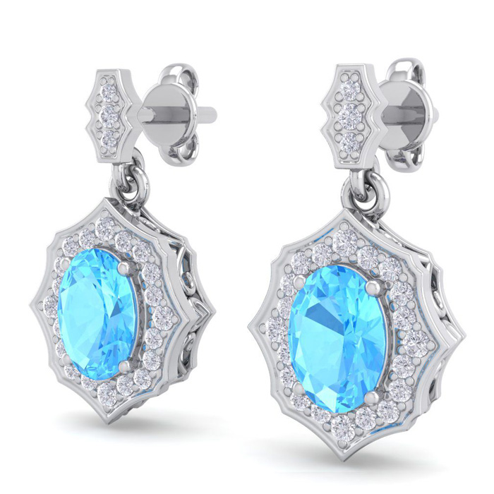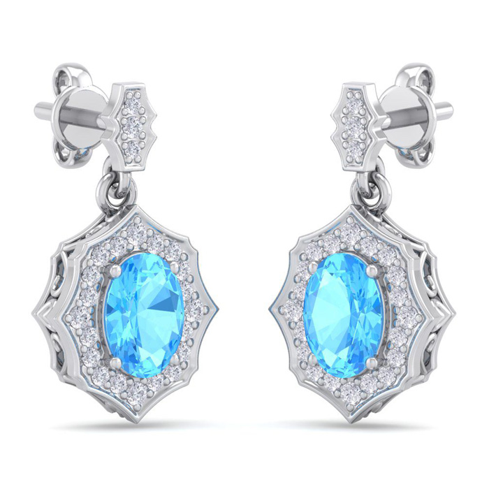 These elegant gemstone earrings feature two 7x5mm oval shape blue topaz gemstones at approximately 2 carats. They are surrounded by 46 sparkling diamonds in I-J color, I1-I2 clarity at 1/4 carat total weight. Total gem weight is approximately 2 1/4 carat total weight. These earrings are in 14 karat white gold and have comfortable and secure friction backs. Each earring dangles down 3/4 inch. *Retrograde Birthstones™ flips the idea of traditional birthstones. Wear your ½ birthday birthstone, your Retrograde Birthstone, “The Birthstone For Your Bad Side™.