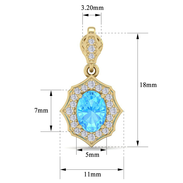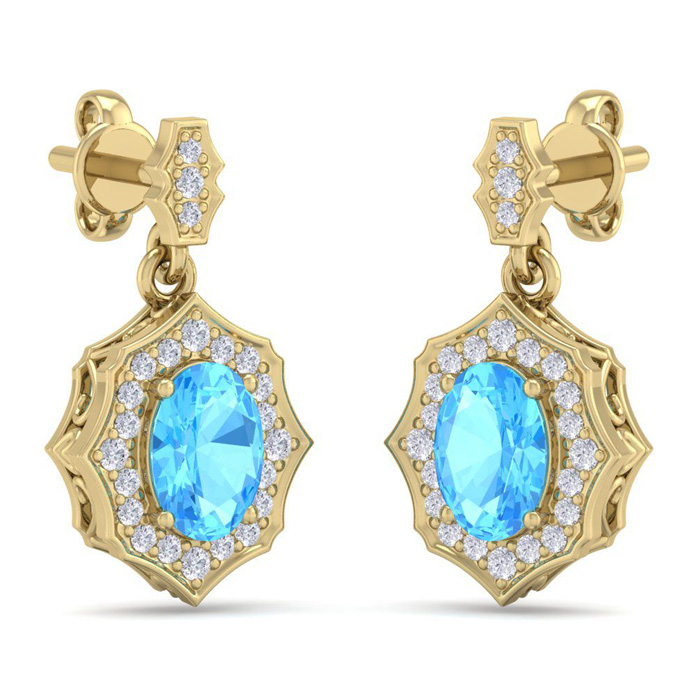 These elegant gemstone earrings feature two 7x5mm oval shape blue topaz gemstones at approximately 2 carats. They are surrounded by 46 sparkling diamonds in I-J color, I1-I2 clarity at 1/4 carat total weight. Total gem weight is approximately 2 1/4 carat total weight. These earrings are in 14 karat yellow gold and have comfortable and secure friction backs. Each earring dangles down 3/4 inch. *Retrograde Birthstones™ flips the idea of traditional birthstones. Wear your ½ birthday birthstone, your Retrograde Birthstone, “The Birthstone For Your Bad Side™.