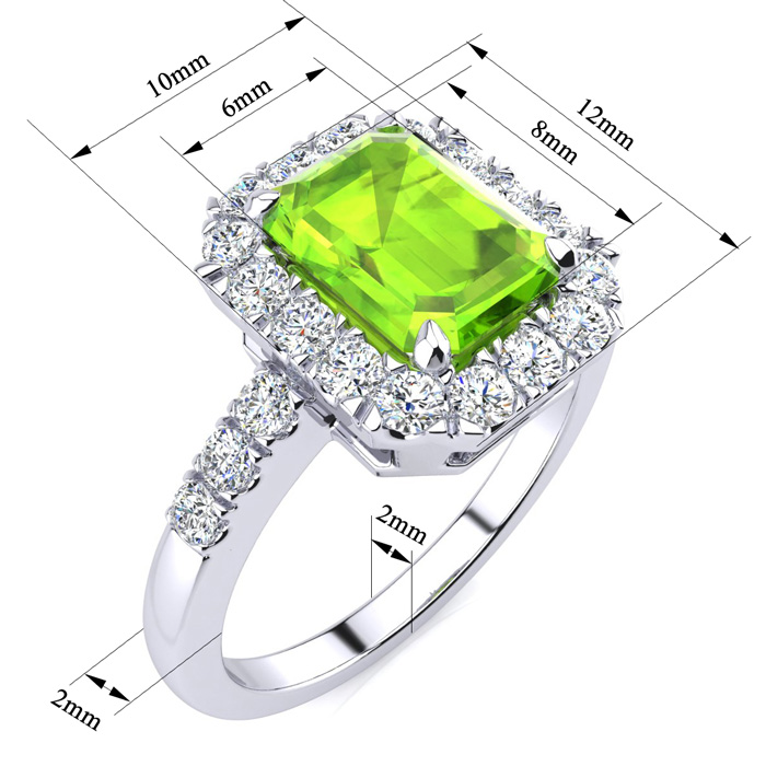 This stunning gemstone and diamond ring features one 8x6mm emerald cut peridot gemstone at 1.75 carats. It is surrounded by 24 sparkling diamonds in a halo and down the band in I-J color, I1-I2 clarity at 0.54 carats. Total gem weight is 2.29 carats. This ring is crafted in 14 karat white gold.