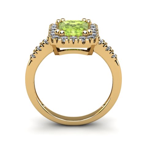 This stunning gemstone and diamond ring features one 8x6mm emerald cut peridot gemstone at 1.75 carats. It is surrounded by 24 sparkling diamonds in a halo and down the band in I-J color, I1-I2 clarity at 0.54 carats. Total gem weight is 2.29 carats. This ring is crafted in 14 karat yellow gold.