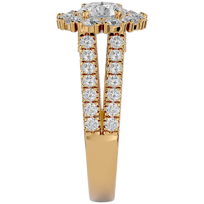 This ring features a 1 carat round shape center diamond in I-J color. There are 44 sparkling side diamonds in a halo and down the split shank in I1-I2 clarity at approximately 1 1/4 carats. Total gem weight is approximately 2.00 carats. This ring is in 14 karat yellow gold.