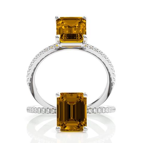 This elegant gemstone and diamond ring features one 9x7mm emerald shape citrine gemstone weighing approximately 2 carats. There are 22 sparkling side diamonds totaling approximately 1/5 carat. Total carat weight is approximately 2 1/5 carats. Diamond color is I-J, diamond clarity is I1-I2. This ring is in 14 karat white gold.