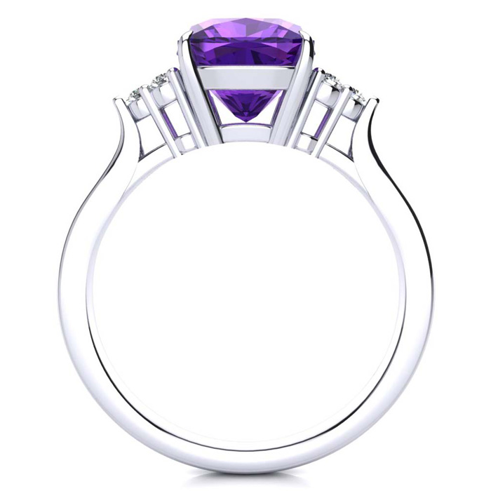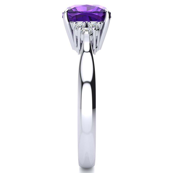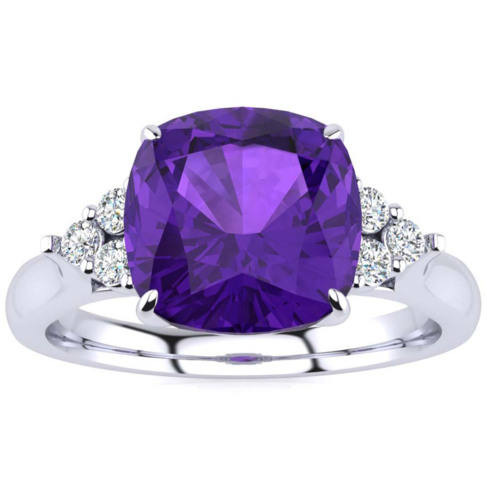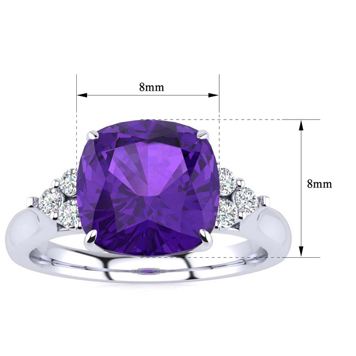 This stunning gemstone and diamond ring features one 8x8mm cushion cut amethyst gemstone at 2.10 carats. It is surrounded by 6 sparkling diamonds in I-J color, I1-I2 clarity at 0.09 carats. Total gem weight is approximately 2.19 carats. This ring is crafted in 14 karat white gold.