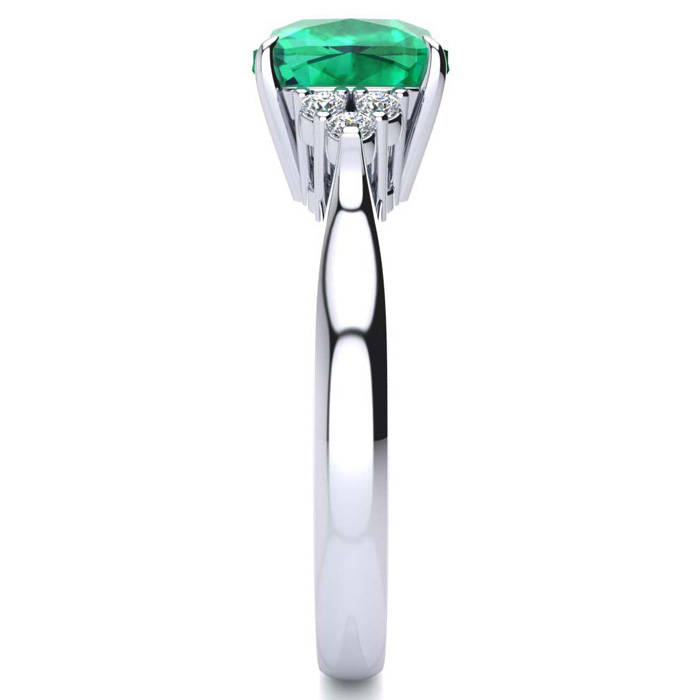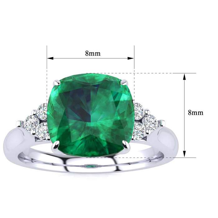 This stunning gemstone and diamond ring features one 8x8mm cushion cut emerald gemstone at 2.10 carats. It is surrounded by 6 sparkling diamonds in I-J color, I1-I2 clarity at 0.09 carats. Total gem weight is approximately 2.19 carats. This ring is crafted in 14 karat white gold.