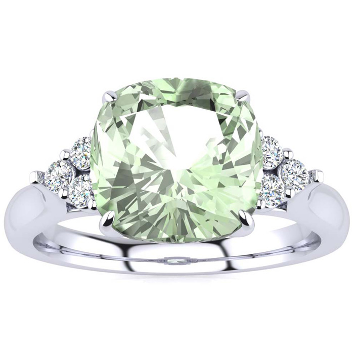 This stunning gemstone and diamond ring features one 8x8mm cushion cut green amethyst gemstone at 2.10 carats. It is surrounded by 6 sparkling diamonds in I-J color, I1-I2 clarity at 0.09 carats. Total gem weight is approximately 2.19 carats. This ring is crafted in 14 karat white gold.