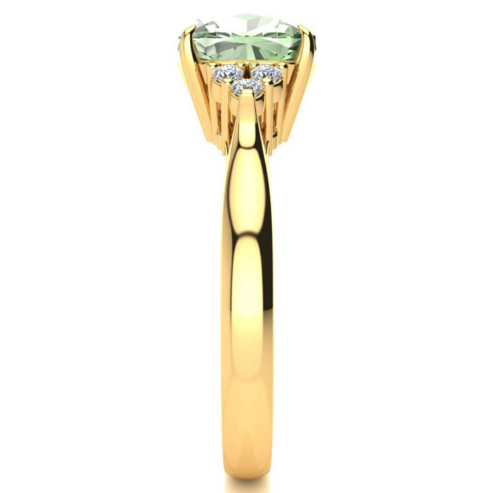 This stunning gemstone and diamond ring features one 8x8mm cushion cut green amethyst gemstone at 2.10 carats. It is surrounded by 6 sparkling diamonds in I-J color, I1-I2 clarity at 0.09 carats. Total gem weight is approximately 2.19 carats. This ring is crafted in 14 karat yellow gold.