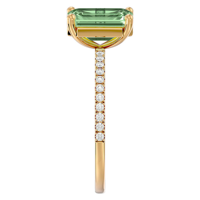 This elegant gemstone and diamond ring features one 9x7mm emerald shape green amethyst gemstone weighing approximately 2 carats. There are 22 sparkling side diamonds totaling approximately 1/5 carat. Total carat weight is approximately 2 1/5 carats. Diamond color is I-J, diamond clarity is I1-I2. This ring is in 14 karat yellow gold.