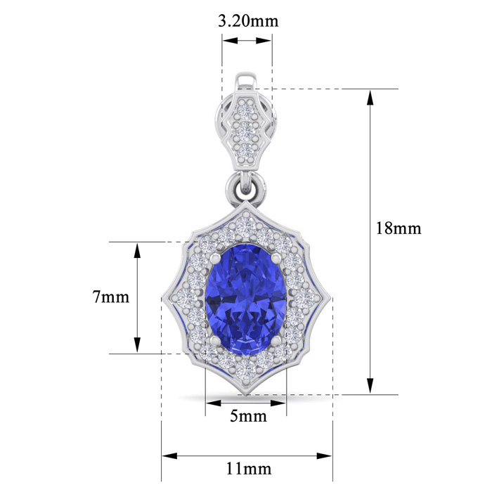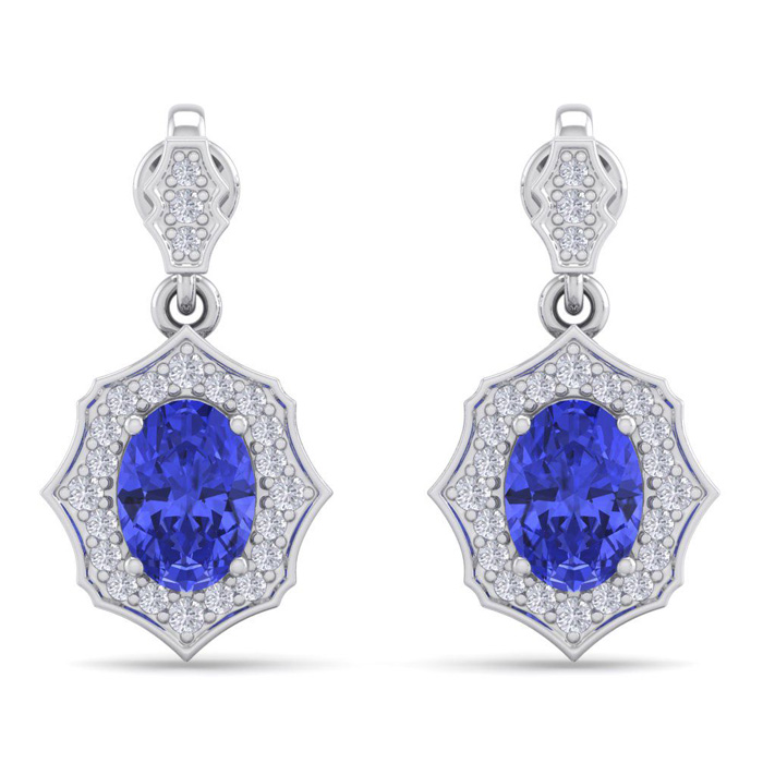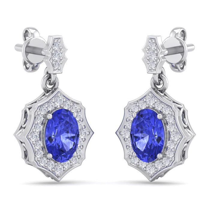 These elegant gemstone earrings feature two 7x5mm oval shape tanzanite gemstones at approximately 1.90 carats. They are surrounded by 46 sparkling diamonds in I-J color, I1-I2 clarity at 1/4 carat total weight. Total gem weight is approximately 2 1/5 Carat total weight. These earrings are in 14 karat white gold and have comfortable and secure friction backs. Each earring dangles down 3/4 inch. *Retrograde Birthstones™ flips the idea of traditional birthstones. Wear your ½ birthday birthstone, your Retrograde Birthstone, “The Birthstone For Your Bad Side™.