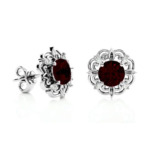 These elegant gemstone earrings feature two 6mm ruby gemstones at approximately 2.10 carats. They are surrounded by 8 sparkling diamonds in I-J color, I1-I2 clarity at 1/10 carat total weight. Total gem weight is approximately 2 1/5 carat total weight. These earrings are in 14 karat white gold and have comfortable and secure friction backs.