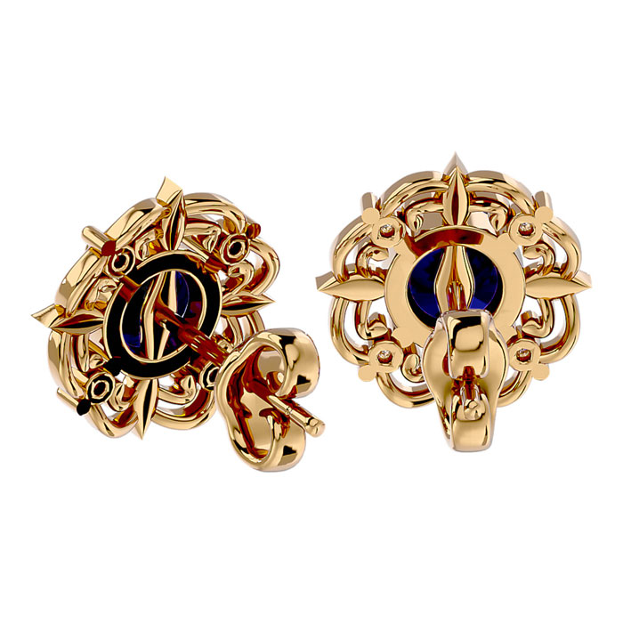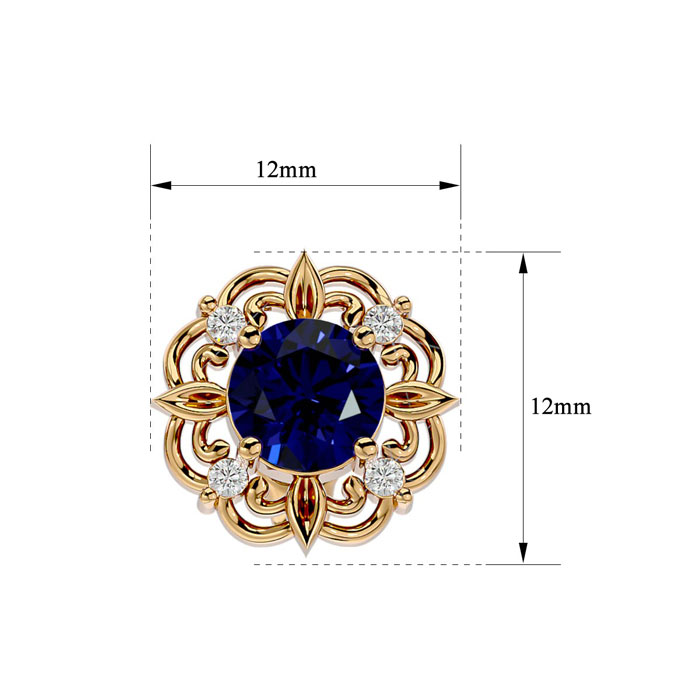 These elegant gemstone earrings feature two 6mm sapphire gemstones at approximately 2.10 carats. They are surrounded by 8 sparkling diamonds in I-J color, I1-I2 clarity at 1/10 carat total weight. Total gem weight is approximately 2 1/5 carat total weight. These earrings are in 14 karat yellow gold and have comfortable and secure friction backs. *Retrograde Birthstones™ flips the idea of traditional birthstones. Wear your ½ birthday birthstone, your Retrograde Birthstone, “The Birthstone For Your Bad Side™.