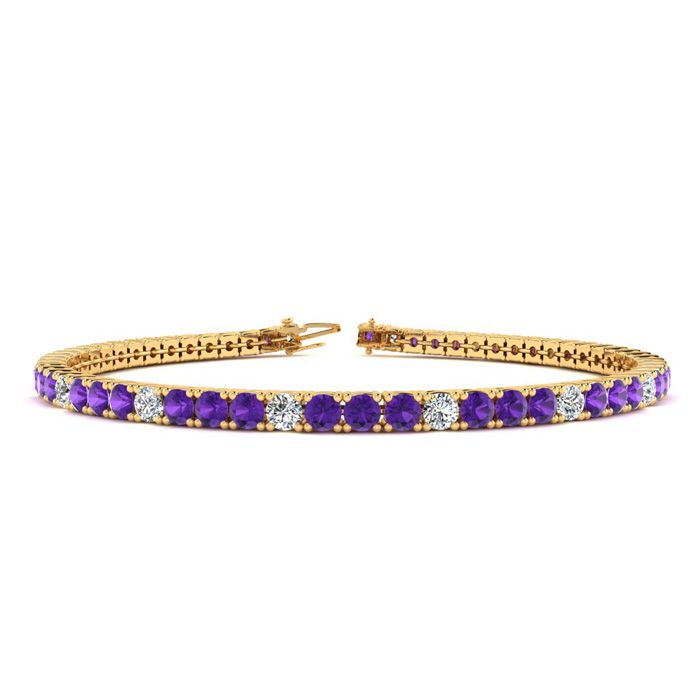 This classic gemstone bracelet features shimmering white diamonds in J-K color, I1-I2 clarity and amethyst gemstones. The 6 inch bracelet contains 57 gemstones and diamonds at 2.71 carats. The 6.5 inch bracelet contains 62 gemstones and diamonds at 2.95 carats. The 7 inch bracelet contains 67 gemstones and diamonds at 3.19 carats. The 7.5 inch bracelet contains 72 gemstones and diamonds at 3.42 carats. The 8 inch bracelet contains 76 gemstones and diamonds at 3.61 carats. The 8.5 inch bracelet contains 81 gemstones and diamonds at 3.85 carats. The 9 inch bracelet contains 86 gemstones and diamonds at 4.09 carats. This bracelet is approximately 2.25mm wide and is crafted in 14 karat yellow gold. This bracelet has a secure, box with tongue and safety clasp.