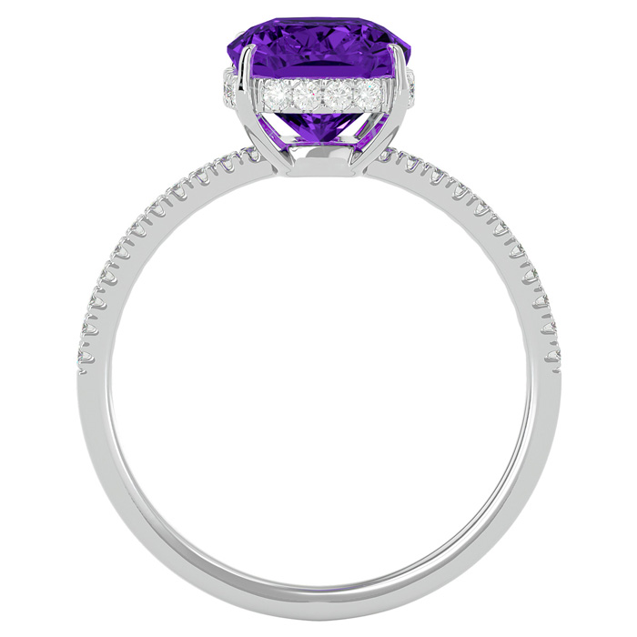 This elegant gemstone ring features one 10x8mm antique cushion shape amethyst gemstone at approximately 2 1/2 carats. It is surrounded by 32 sparkling diamonds in I-J color, I1-I2 clarity at 1/4 carat total weight. Total gem weight is approximately 2 3/4 carats. This ring is in 14 karat white gold.