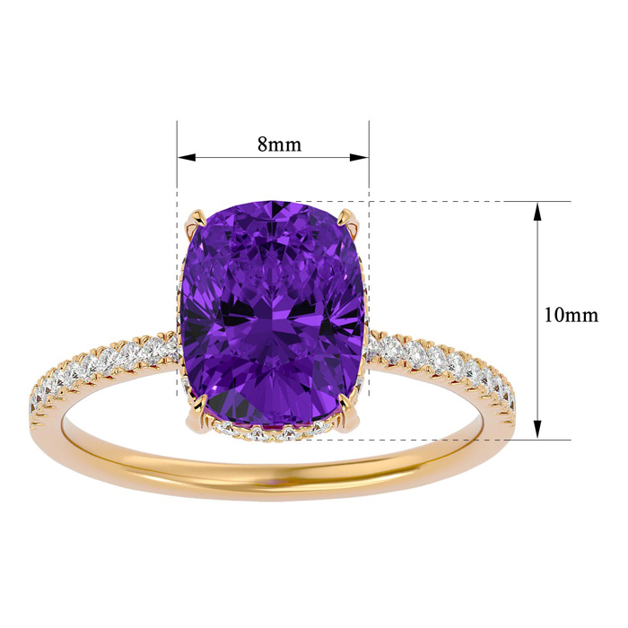 This elegant gemstone ring features one 10x8mm antique cushion shape amethyst gemstone at approximately 2 1/2 carats. It is surrounded by 32 sparkling diamonds in I-J color, I1-I2 clarity at 1/4 carat total weight. Total gem weight is approximately 2 3/4 carats. This ring is in 14 karat yellow gold.