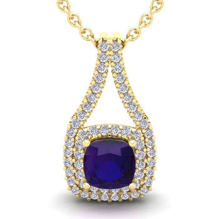 2 3/4 Carat Cushion Cut Amethyst and Double Halo Diamond Necklace In 14 Karat Yellow Gold, 18 Inches