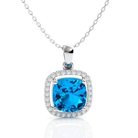 This elegant gemstone necklace features one 8mm cushion shape blue topaz gemstone weighing approximately 2.70 carats. It is surrounded by 28 sparkling diamonds in I-J color, I1-I2 clarity at 0.15 carats. Total gem weight is approximately 2 3/4 carats. This necklace is in 14 karat white gold and comes with an 18 inch chain with a spring-ring clasp.