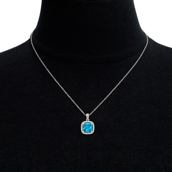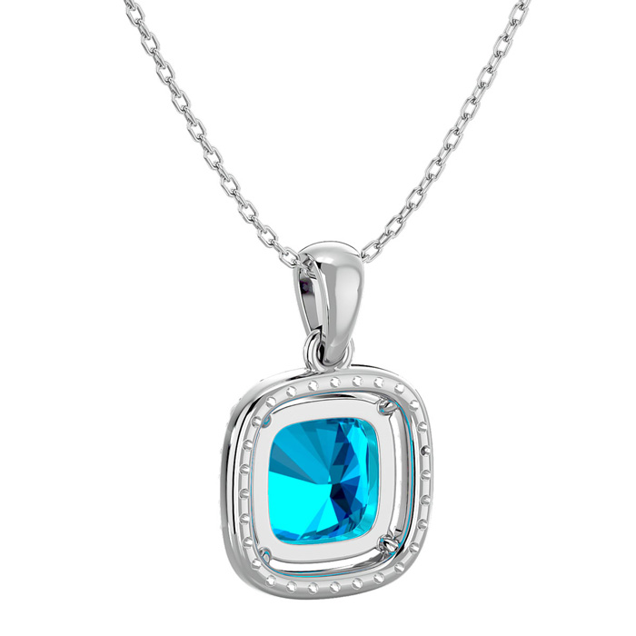 2 3/4 Carat Cushion Cut Blue Topaz and Halo Diamond Necklace In 14 Karat White Gold, 18 Inches