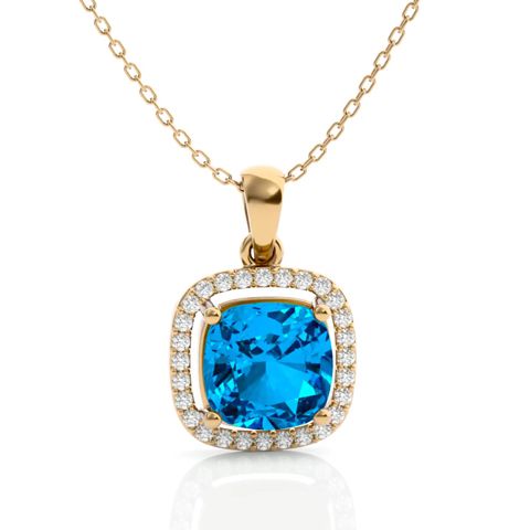 2 3/4 Carat Cushion Cut Blue Topaz and Halo Diamond Necklace In 14 Karat Yellow Gold, 18 Inches