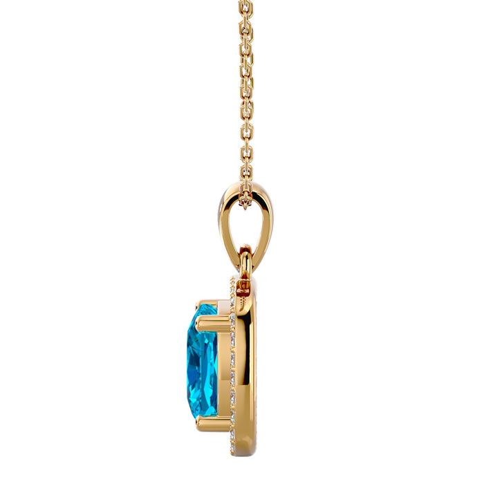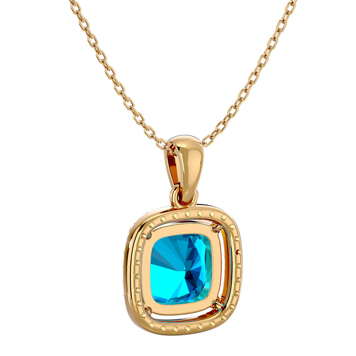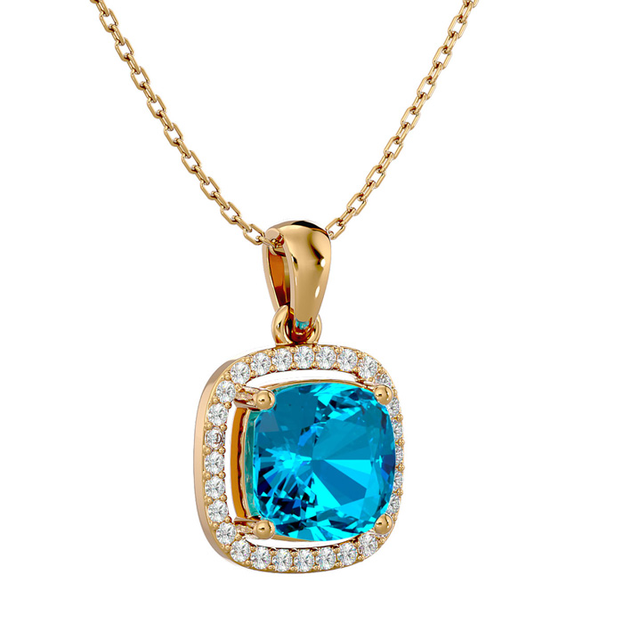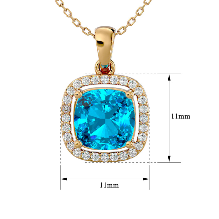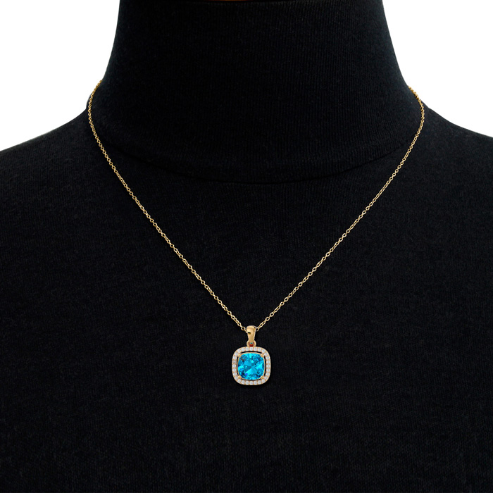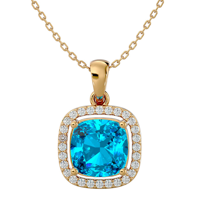 2 3/4 Carat Cushion Cut Blue Topaz and Halo Diamond Necklace In 14 Karat Yellow Gold, 18 Inches