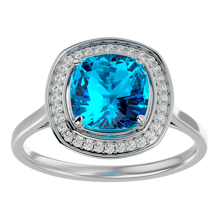 This stunning gemstone and diamond ring features one 8x8mm cushion cut blue topaz gemstone at 2.70 carats. It is surrounded by 32 sparkling diamonds in I-J color, I1-I2 clarity at 0.16 carats. Total gem weight is approximately 2 3/4 carats. This ring is crafted in 14 karat white gold.