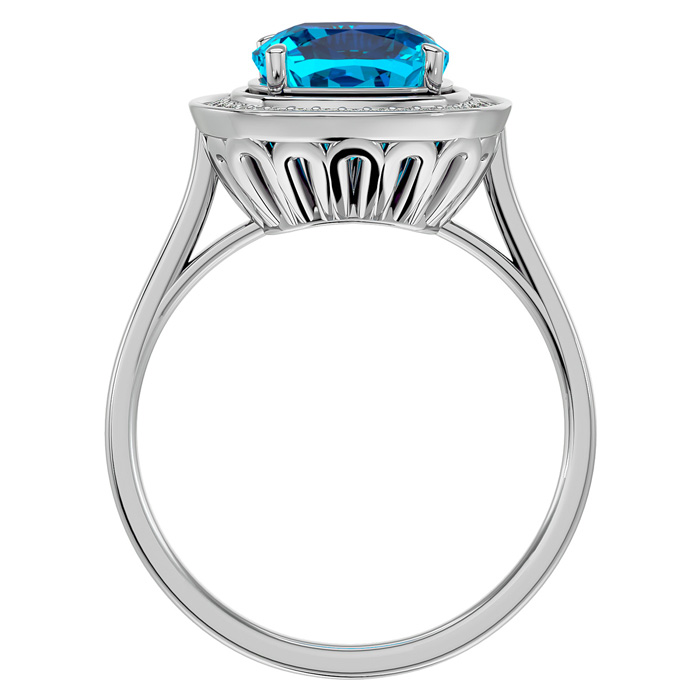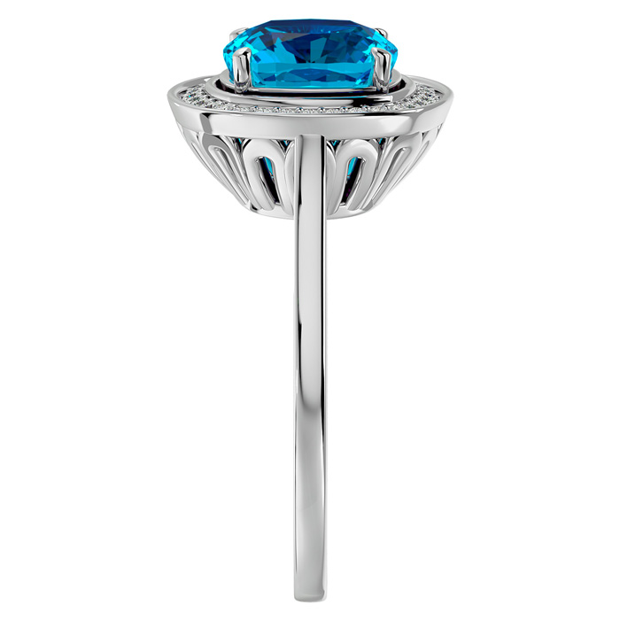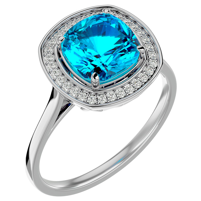 2 3/4 Carat Cushion Cut Blue Topaz and Halo Diamond Ring In 14K White Gold