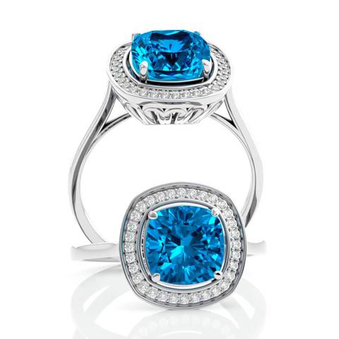 This stunning gemstone and diamond ring features one 8x8mm cushion cut blue topaz gemstone at 2.70 carats. It is surrounded by 32 sparkling diamonds in I-J color, I1-I2 clarity at 0.16 carats. Total gem weight is approximately 2 3/4 carats. This ring is crafted in 14 karat white gold.
