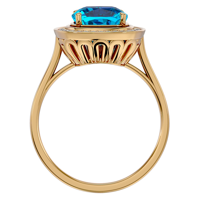 2 3/4 Carat Cushion Cut Blue Topaz and Halo Diamond Ring In 14K Yellow Gold